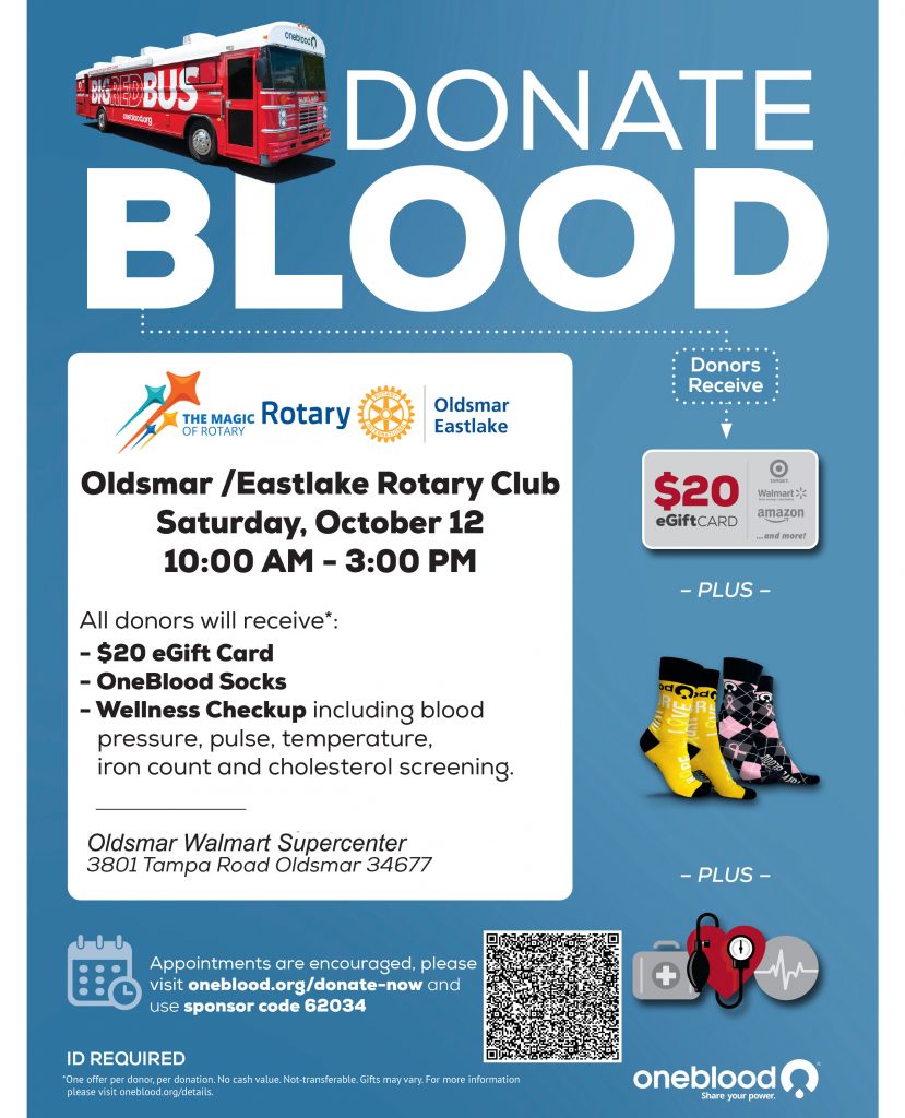 Oldsmar/Eastlake Rotary Blood Drive Oct. 12, 2024. Posted on September 21, 2024 by Admin 2022 YOU DON’T HAVE TO BE A DOCTOR TO SAVE LIVES! PLEASE DONATE.